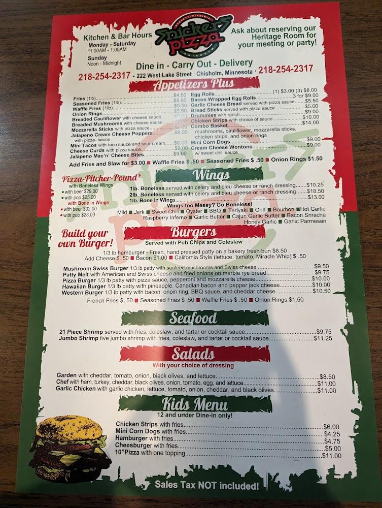 Welcome to Snickers Pizza & Pub, your go-to spot in Chisholm for delicious pizza and a vibrant pub atmosphere. Located at 222 W Lake St, we offer convenient take-out and delivery services to Chisolm, Buhl, Kitzville, and Balkan. Enjoy our mouth-watering local specialties, great cocktails, and a perfect setting for sports enthusiasts. Whether you're stopping by for lunch, dinner, or late-night bites, our accessible, laid-back ambiance welcomes everyone—from students to tourists. With late-night catering and happy hour discounts, Snickers Pizza & Pub is the ideal choice for any occasion. Call us at +1 218-254-2317 to place your order today!